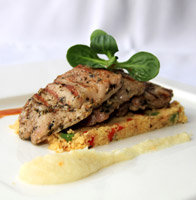 Recipe of the month Veal cutlets with Rémy Martin sauce, cauliflower mousse with orange and a couscous salad Ingredients (serves 4): Preparation: Bring the meat broth to the boil, add rosemary and boil until 1/3 of the liquid has evaporated. Add cognac and bring to the boil. Before serving, add butter to thicken the sauce. Boil the cauliflower in salted water, dry. Bring the cream to the boil, add cauliflower and blend. Grate the scalded orange peel on the cauliflower and squeeze the juice from the rest of the orange to add taste. Boil the couscous. Cut the vegetables into 5 mm cubes and fry on olive oil. At the end of the frying, add chopped garlic. Mix the vegetables with the couscous and add chopped basil. Season to taste.